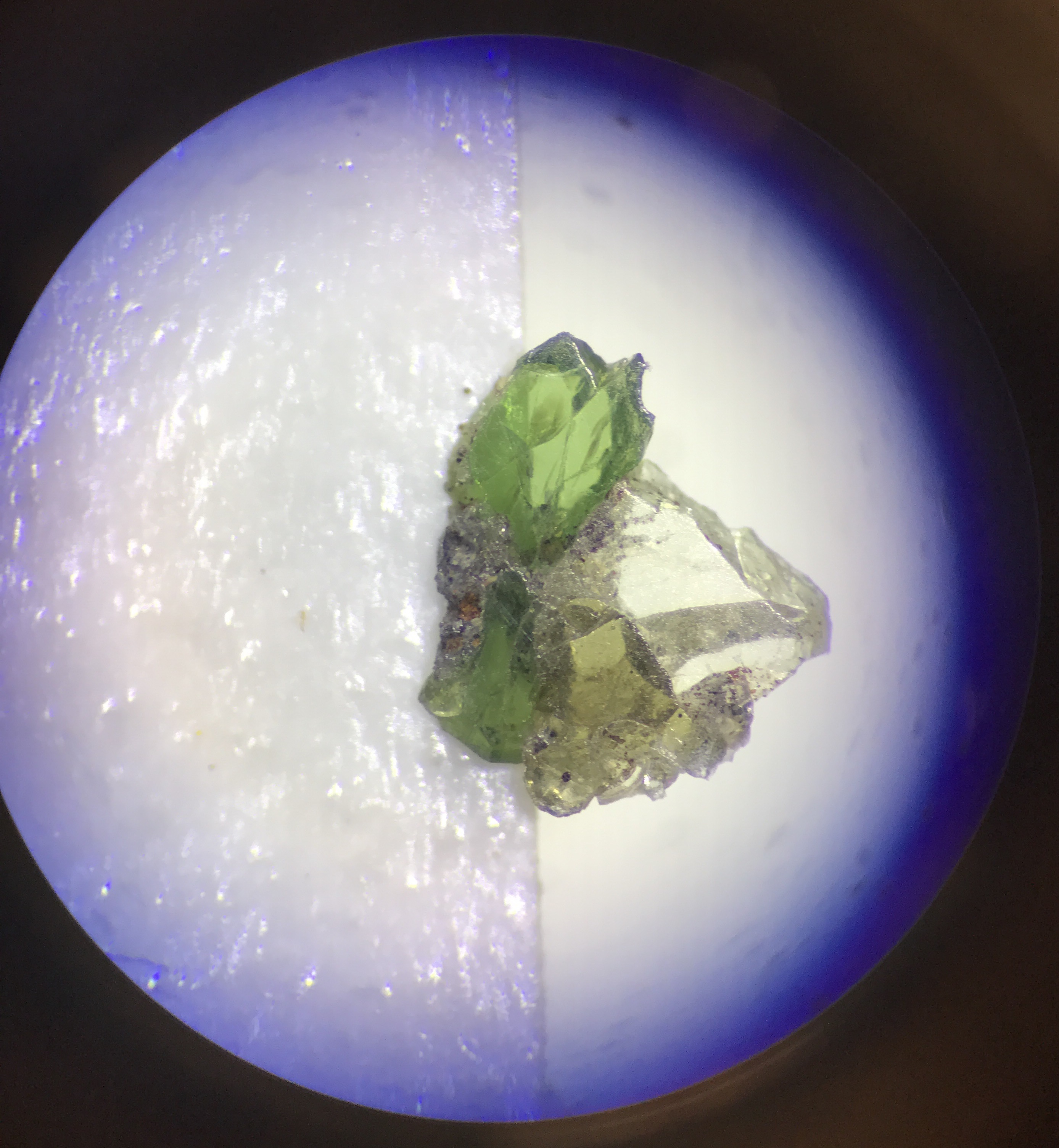 Here is my own submission a cluster of pyroxenes and olivine mounted for analysis by infrared spectroscopy. This image was taken prior to analysis using a cellphone camera through a microscopy ocular lens to document the sample orientation